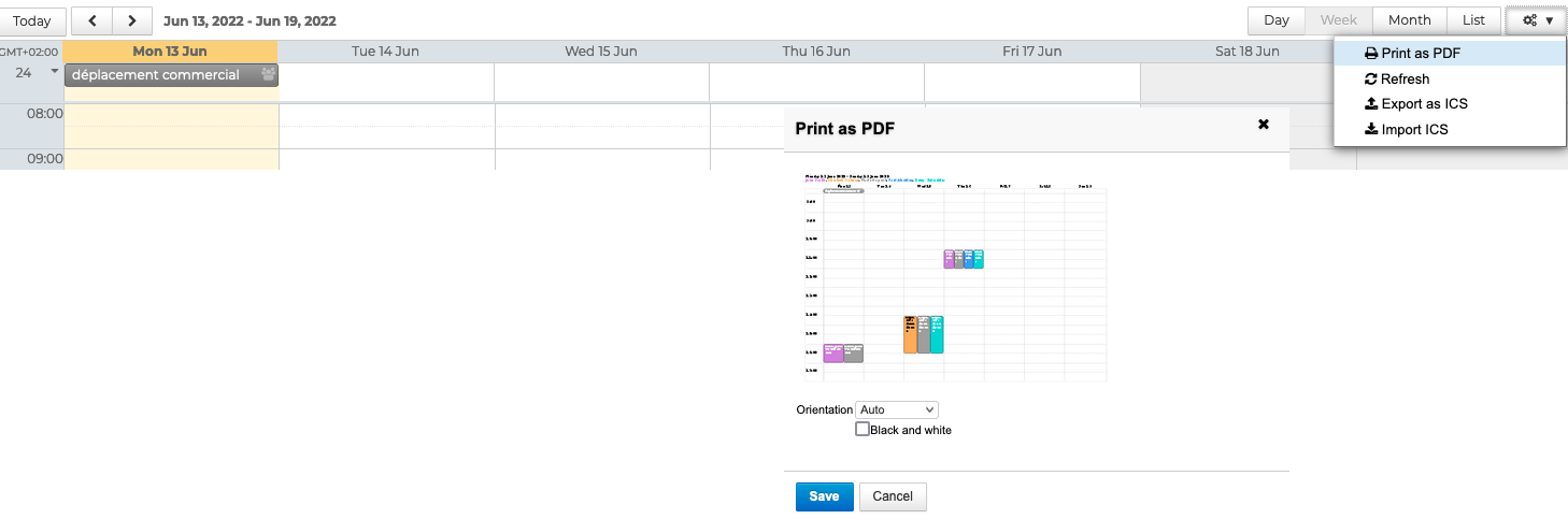 Sie können die Ansichten des Kalenders, wie sie auf dem Bildschirm angezeigt werden, im PDF-Format exportieren und anschließend speichern und/oder ausdrucken.