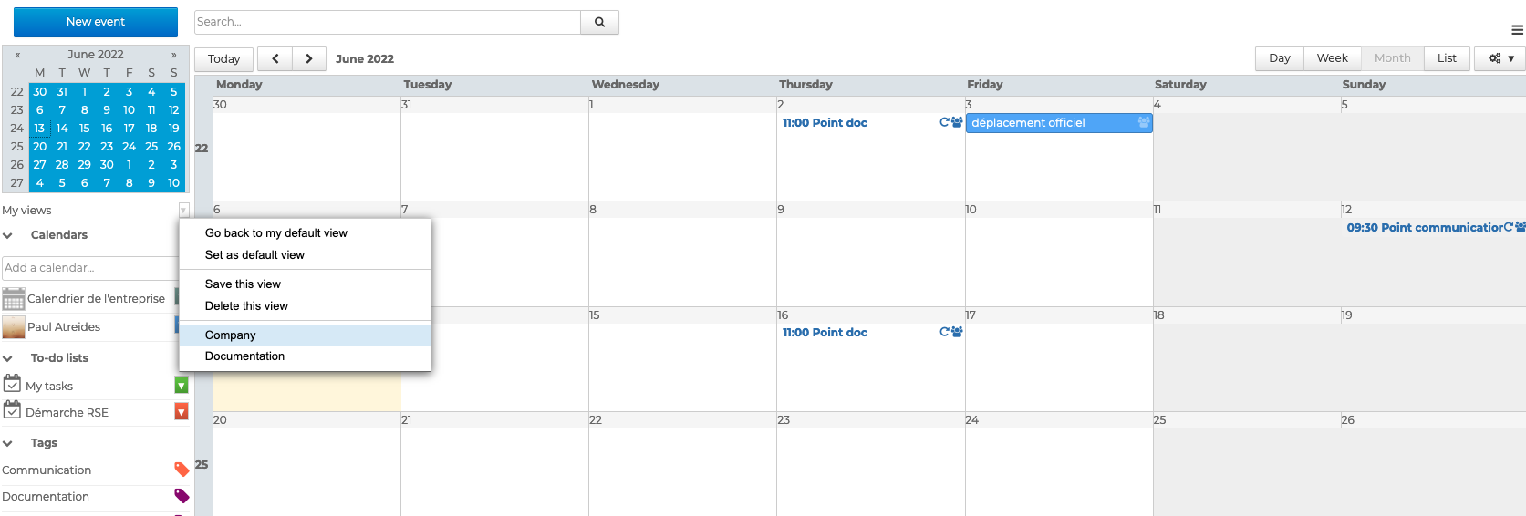 Durch das vorherige Speichern verschiedener Ansichten ermöglicht der BlueMind-Kalender den schnellen Zugriff auf eine Reihe von Kalendern (zum Beispiel alle Kalender der Mitglieder eines Dienstes) mit einer vordefinierten Anzeige (täglich, wöchentlich, monatlich oder als Liste).