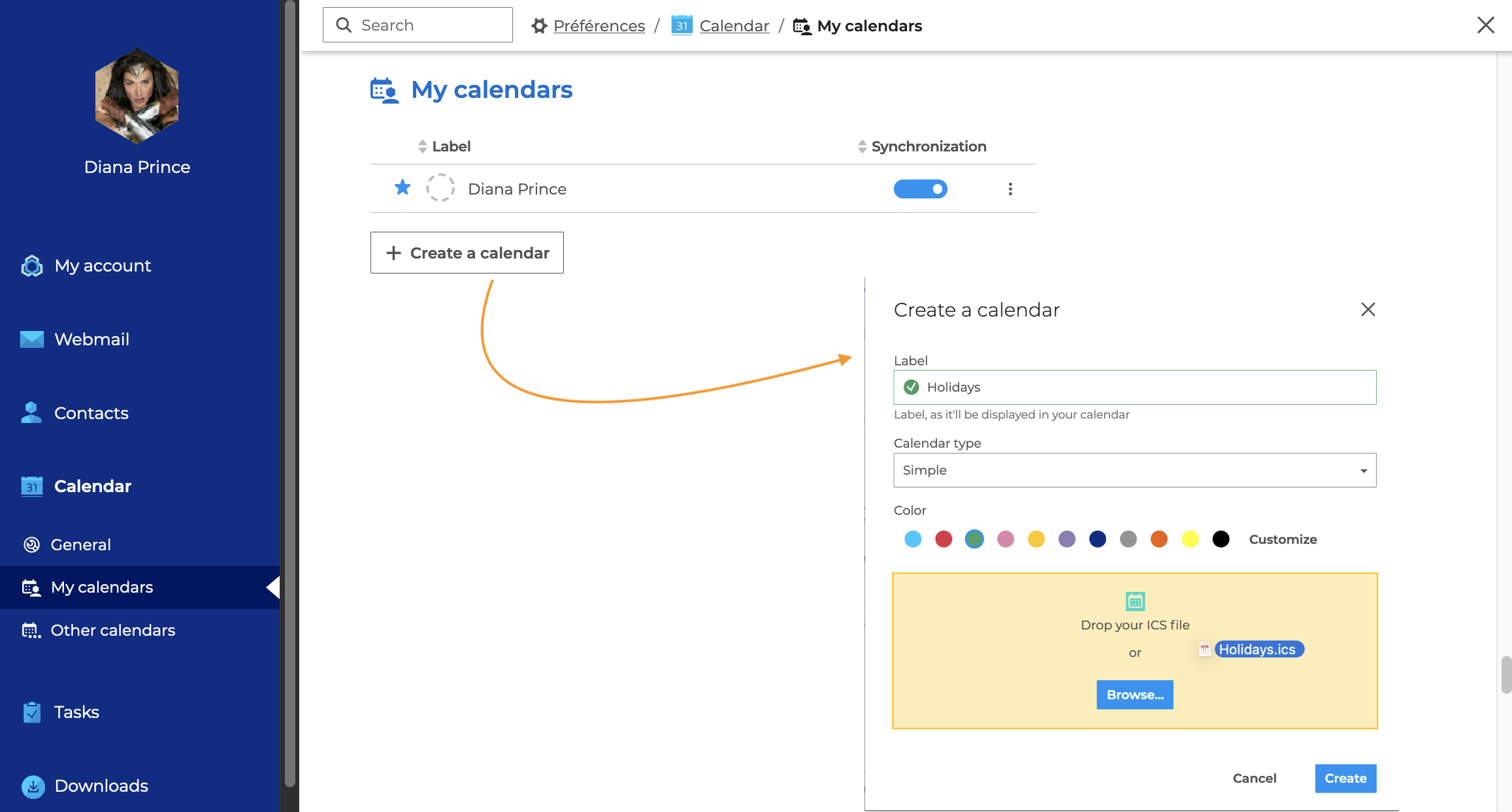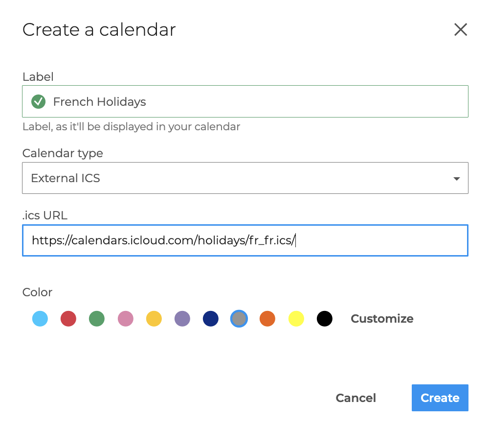 Es ist auch möglich, eine Datei iCalendar (Erweiterung ics) einzufügen, um einen neuen Kalender mit Daten aus einem externen Kalender zu erstellen.