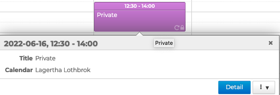 Die Privatsphäre : Standardmäßig sind Veranstaltungen öffentlich. Das Ereignis kann als "Privat" eingestellt werden. In diesem Fall können die Nutzer mit Zugriff auf den Kalender das Ereignis sehen, aber nicht seine Informationen: