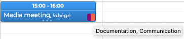Es ist möglich, so viele Kategorien wie gewünscht zuzuweisen. Die Kategorien sind dann auf der Veranstaltung durch farbige Symbole sichtbar (maximal 2). Wenn Sie mit der Maus darüber fahren, wird die vollständige Liste der Kategorien angezeigt, die dem Ereignis zugeordnet sind.