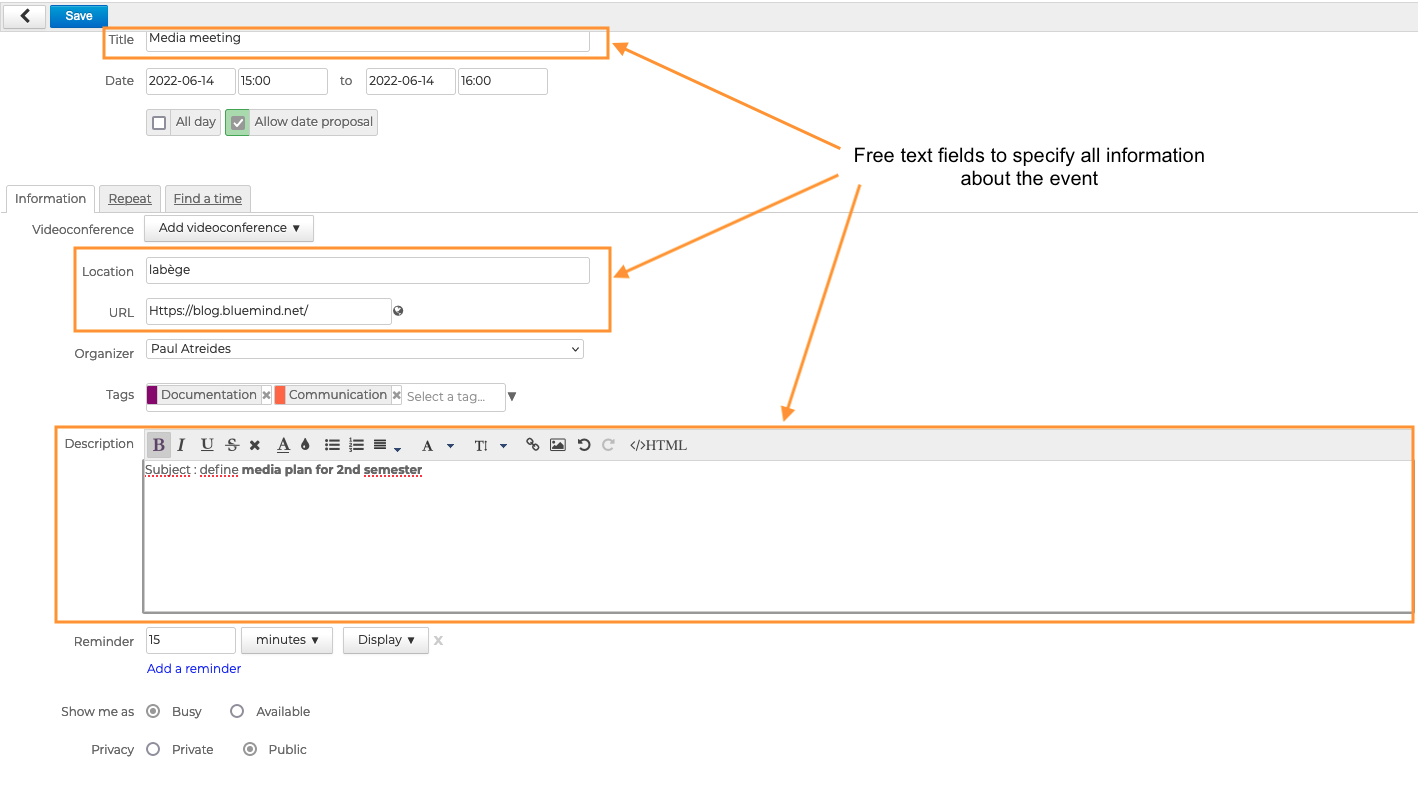 - Titel : gibt den Namen oder das Hauptthema des Ereignisses an - Pflichtfeld für Freitext