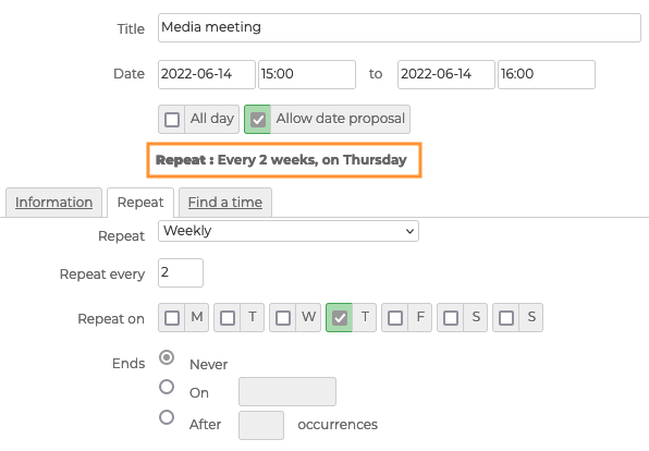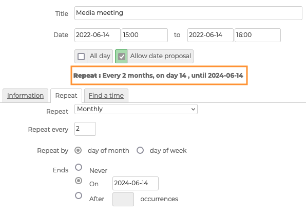 Für regelmäßig wiederkehrende Ereignisse, wie z.B. ein monatliches Treffen, ermöglicht der BlueMind Terminkalender, das Ereignis nur einmal zu erstellen und den Beginn, das Ende und die Häufigkeit der Wiederholung einzustellen. Es ist dann möglich, einzelne Fälle oder die gesamte Serie zu bearbeiten.