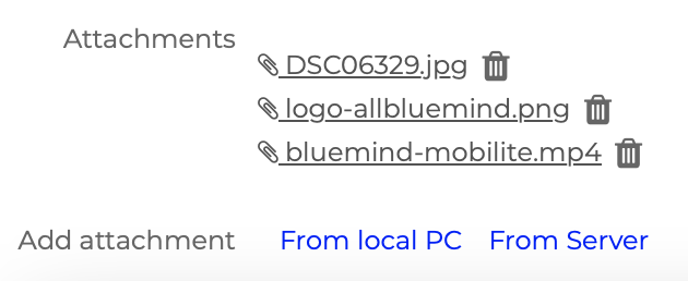 - Drive: Ermöglicht das Anhängen von Dateien, die vom Benutzer auf dem BlueMind Server gespeichert sind.