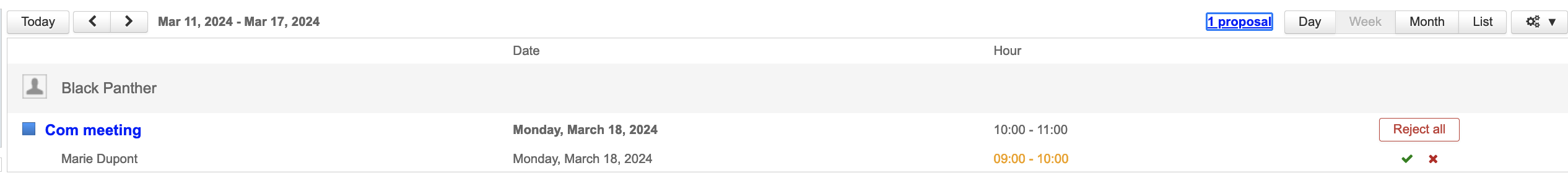 Wenn ein Benutzer einen Vorschlag für einen neuen Zeitplan sendet, kann der Organisator oder sein Delegierter (siehe Delegationen verwalten) den Vorschlag akzeptieren oder ablehnen über die per E-Mail erhaltene Benachrichtigung oder in der Aktionsleiste seines Kalenders: