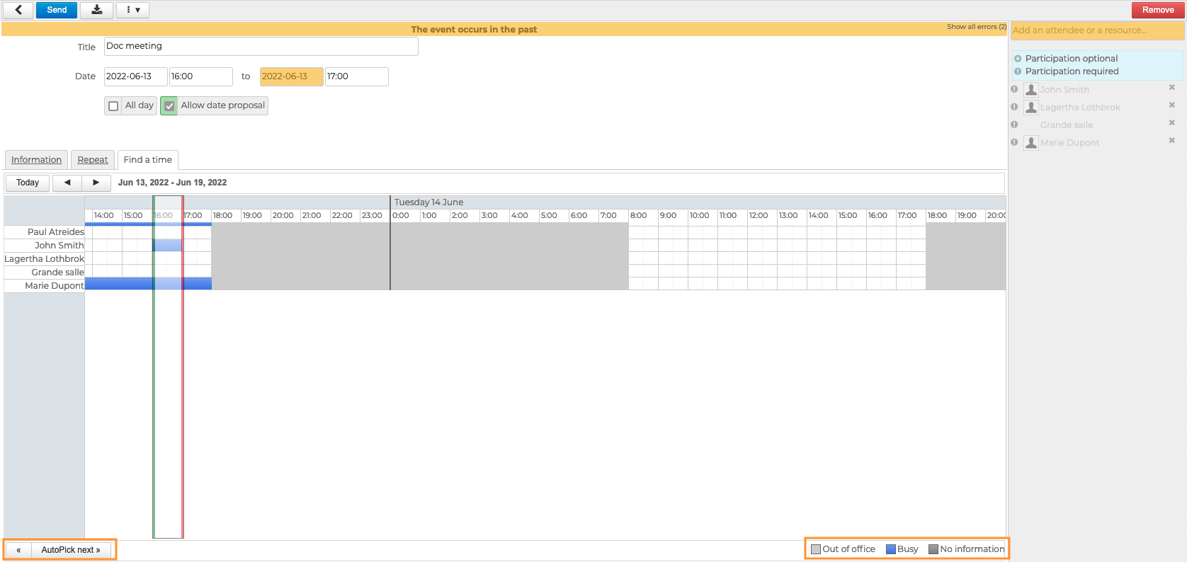 BlueMind schlägt automatisch den ersten verfügbaren Zeitrahmen vor, der grün und rot umrahmt ist und auf dem Datum basiert, das Sie in das Formular eingegeben haben. Um automatisch zum nächsten Zeitpunkt zu gelangen, klicken Sie auf "Automatische Auswahl des nächsten" unten links.