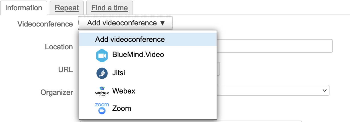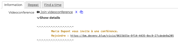 BlueMind bietet die Möglichkeit, Videokonferenzen mit Veranstaltungen zu verknüpfen, mit Hilfe verschiedener Lösungen: