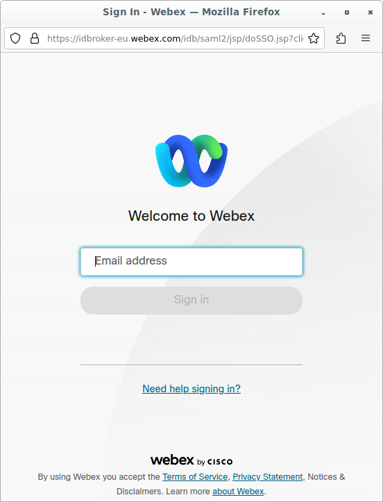 Beim Hinzufügen einer Webex-Videokonferenz öffnet sich ein Popup, in dem Sie aufgefordert werden, sich mit einer E-Mail-Adresse anzumelden: