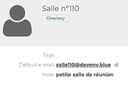 | RESSOURCEN Es handelt sich um die vom Unternehmen bereitgestellten Ressourcen für die Nutzer, z. B. ein Besprechungsraum. ![]() | Adressbuch : Ressourcen werden vom Administrator erstellt und sind Teil des Adressbuches Man kann: - die Ressource buchen (siehe Ein Treffen organisieren) - der Administrator und/oder Verwalter kann Ressourcenreservierungen verwalten Man kann nicht: - den Kontaktdatensatz der Ressource editieren. Der Eintrag wird vom Administrator erstellt und verwaltet. |