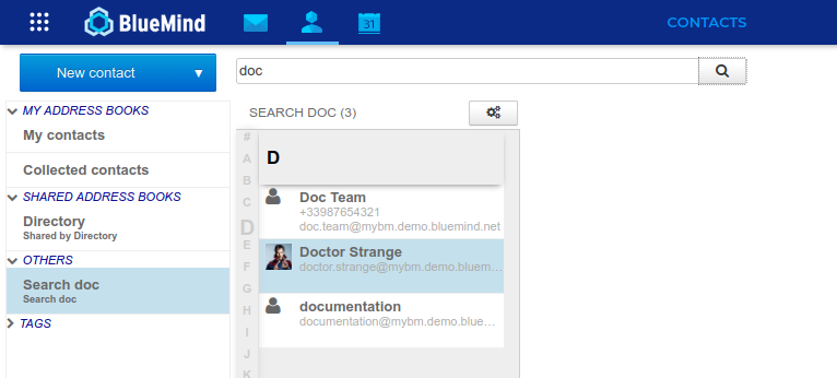 BlueMind bietet eine Verwaltung von Kontakten über Adressbücher.