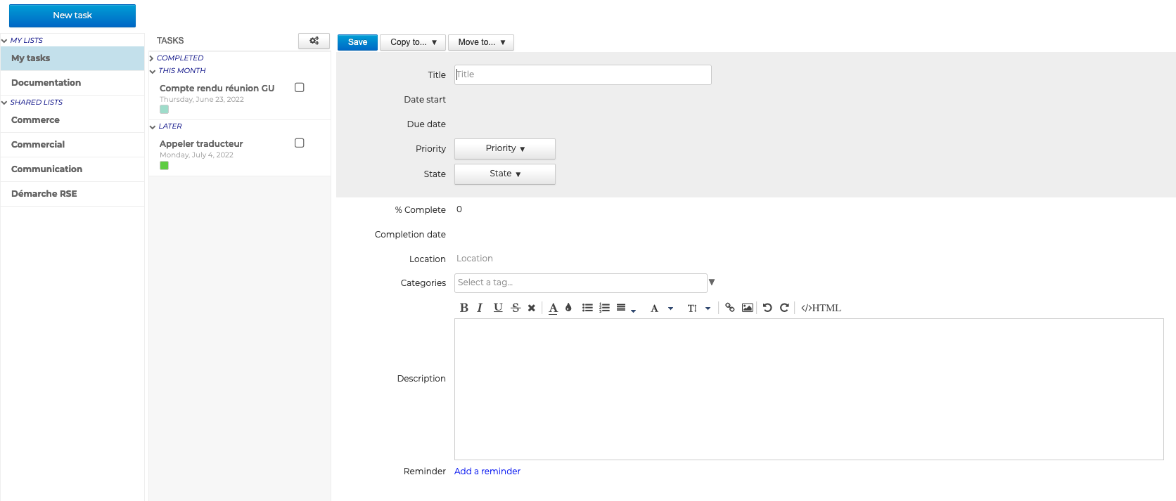 Um eine Aufgabe hinzuzufügen, positionieren Sie sich auf der gewünschten Liste und klicken Sie auf "Neue Aufgabe", um das Erstellungsblatt zu öffnen