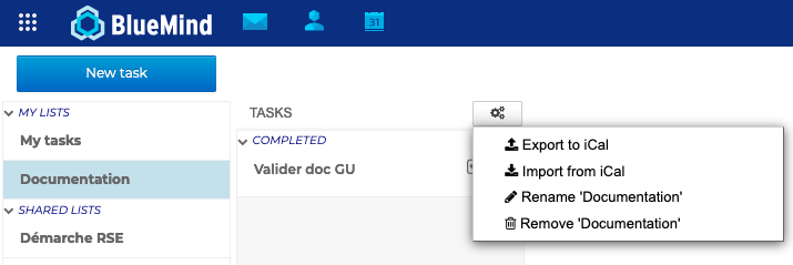 Die Aufgaben-App ermöglicht einen schnellen Zugriff auf die wichtigsten Optionen: Aufgaben importieren, exportieren, eine Aufgabenliste umbenennen oder löschen.