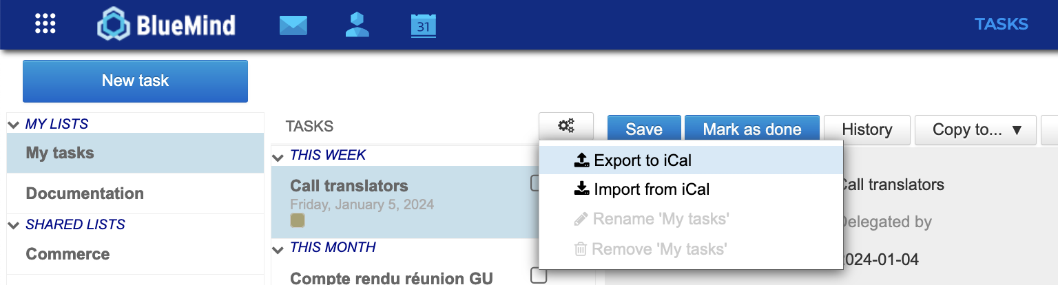 Les listes de tâches BlueMind können auch in eine iCal Datei exportiert werden.