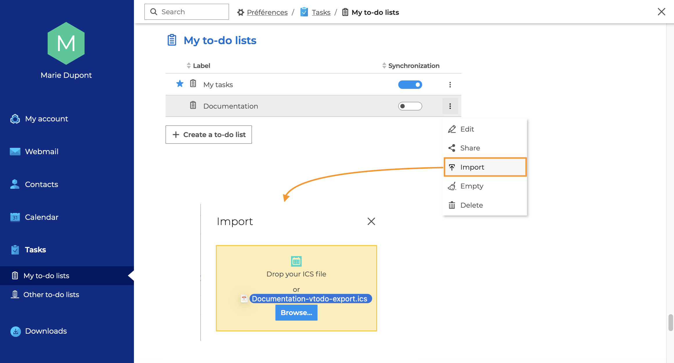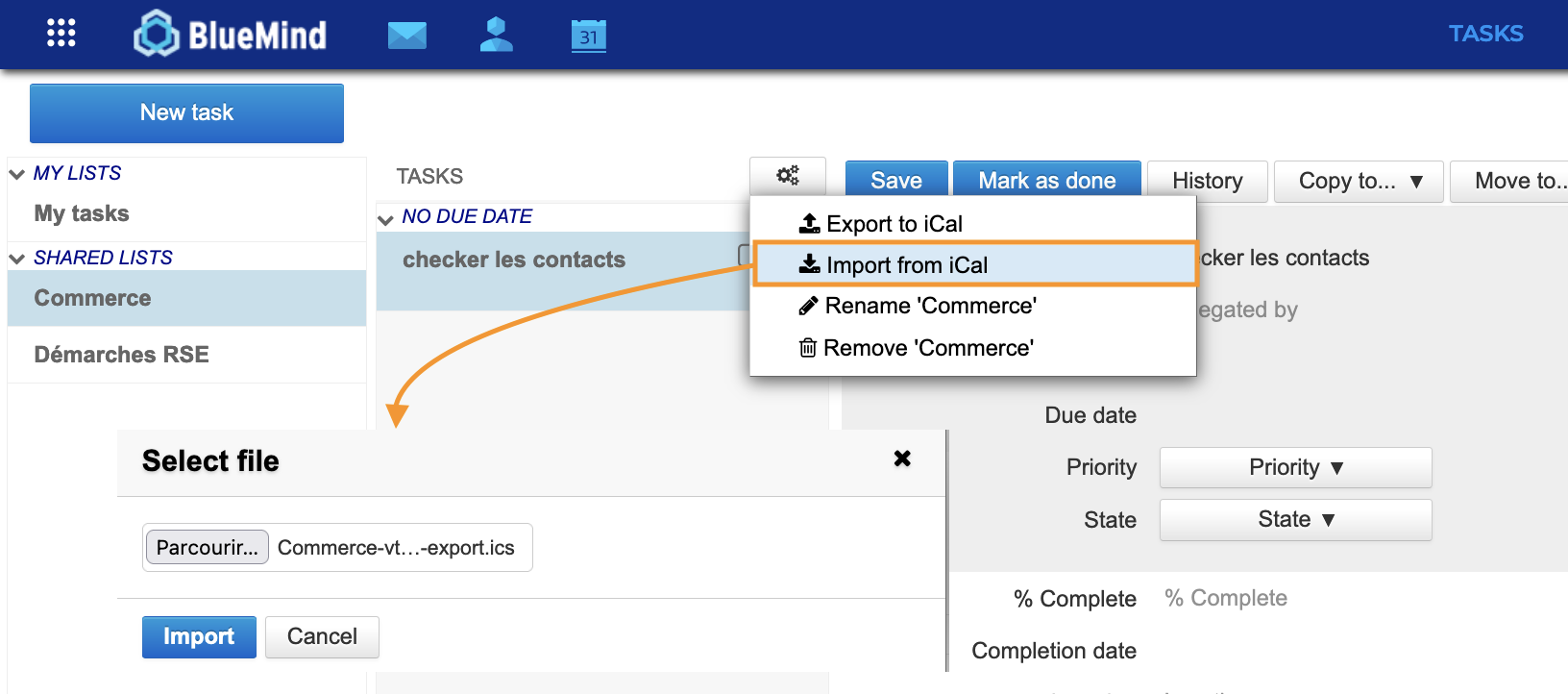 Il est possible d'ajouter des tâches issues d'une liste externe dans une liste de tâches BlueMind en importieren einer iCalendar (iCal) Datei.