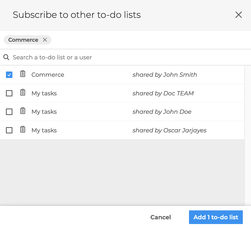 Wählen Sie die Aufgabenliste(n) aus, die von anderen Benutzern geteilt wurden, und klicken Sie auf "Hinzufügen". Die ausgewählten Listen erscheinen dann in der Liste der "Anderen Aufgabenlisten".