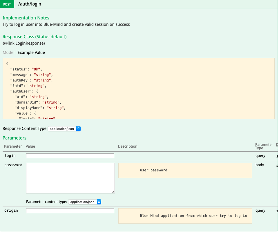 curl -X POST -k --header 'Content-Type: application/json' --header 'Accept: application/json' -d '"password"' 'https://<domaine>/api/auth/login?login=<login@domain>'.