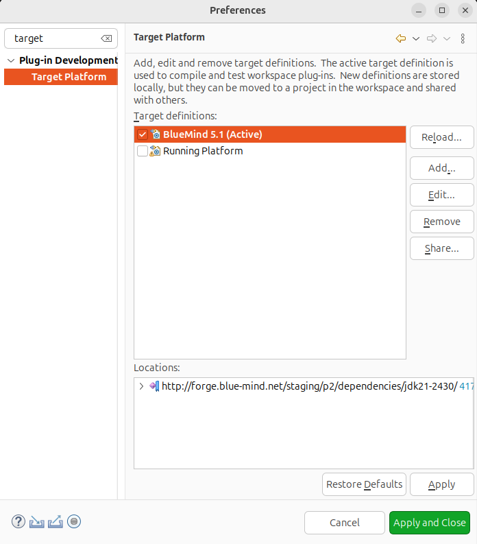 Die Eclipse-Laufzeitplattform muss mit den Abhängigkeiten von BlueMind :