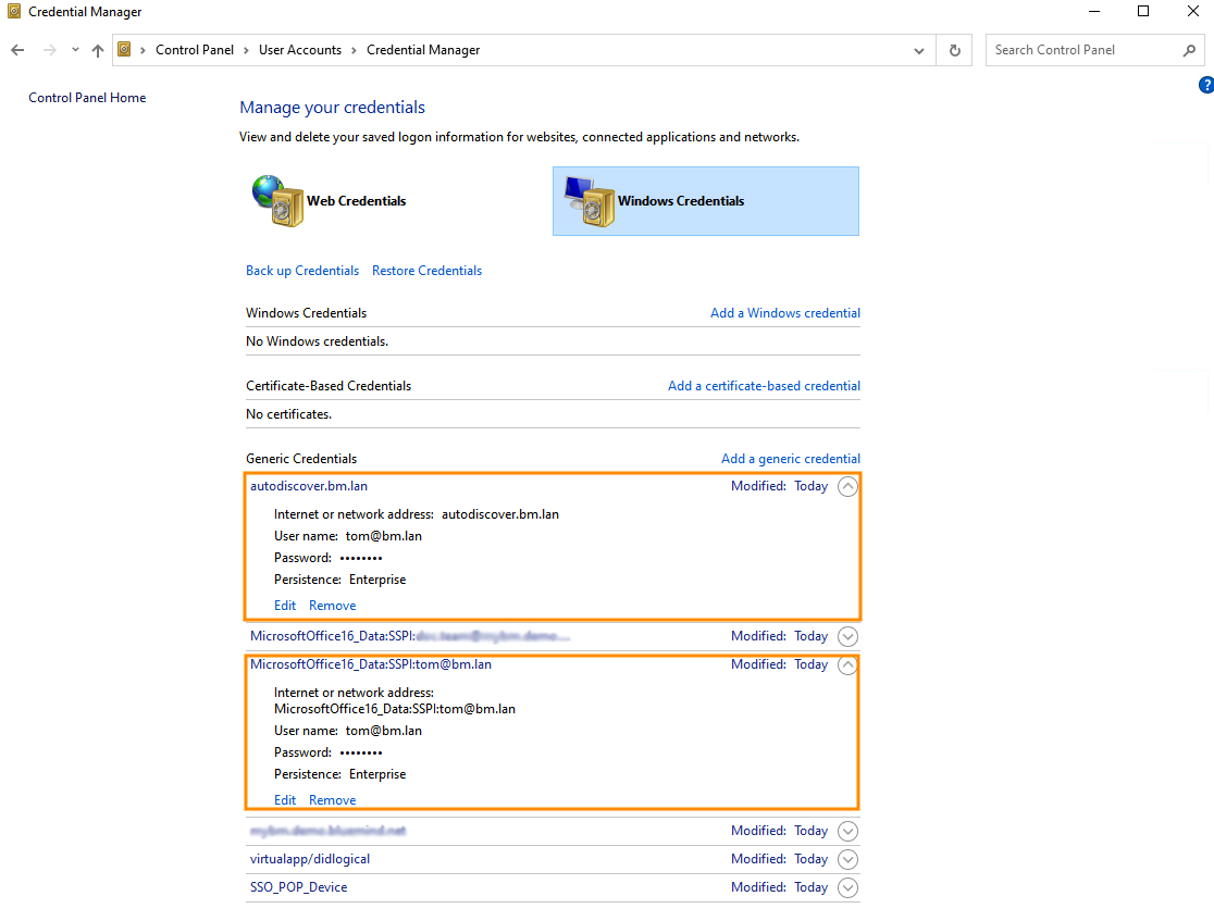 autodiscover.domaine.tldundMicrosoftOffice16_SSPI:utilisateur@domaine.tld. Beispiel zum Löschen des Passworts von tom@bm.lan: