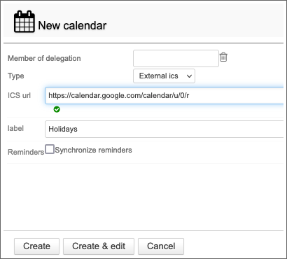 - When you leave the box (with the shift key or by clicking outside the box) BlueMind validates the url. As long as the url is considered invalid, the calendar cannot be created.