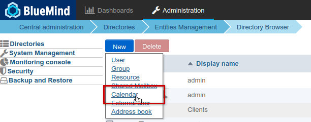 - From the Directories home page, click on "Create a calendar" or from the list of directory entries use the button New > Calendar: