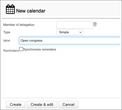 - Click on "Create" for a simple and direct creation of the calendar, or click on "Create & edit" to create the calendar and access the configuration options.