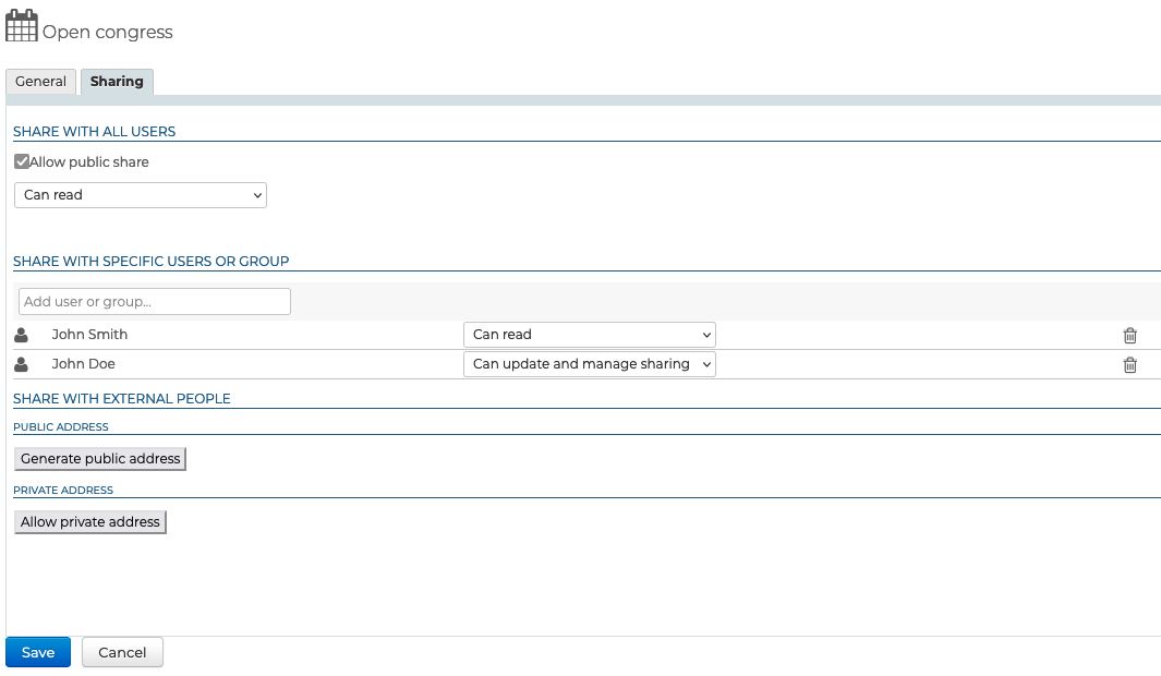 - Can update and manage sharing: can, in addition to writing, administer the calendar's sharing options