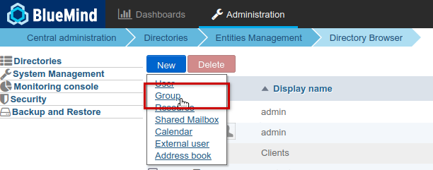 From the Directories home page, click on "Create a group" or from the list of directory entries use the button New > Group: