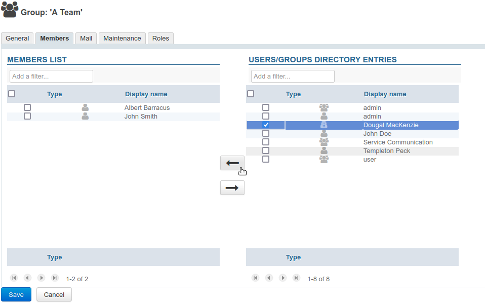 The "Members" tab displays group member management in 2 columns: in the left-hand column, members already present in the group; in the right-hand column, other users and groups present in the directory.