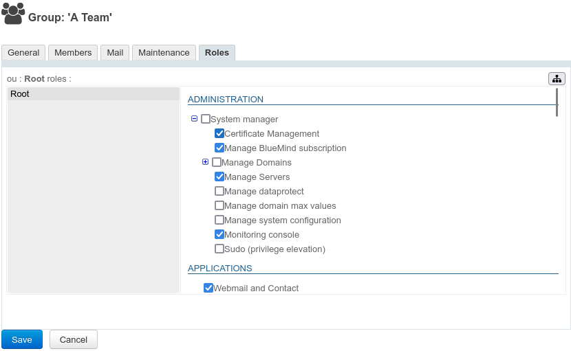 The Roles tab lets you assign administrative rights and specify the applications or functions to which group members have access: