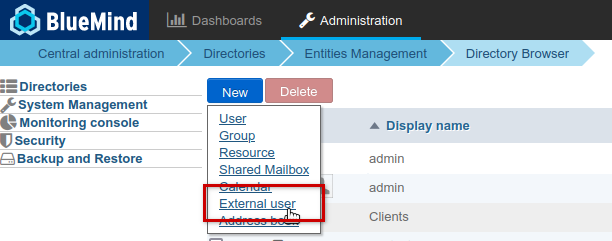 External users are users who do not have a BlueMind account but have an email address outside BlueMind. These users can be added to BlueMind groups in order to receive messages.