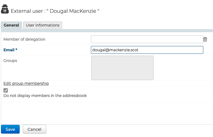 - Do not display members in the address book: the user can be a member of a group but their card will not appear in the directory - this option is active by default, it can be deactivated/reactivated at any time later