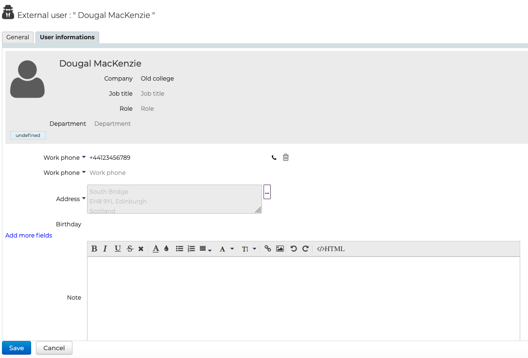 The "User information" tab is used to enter the user's contact details for sharing in the directory: