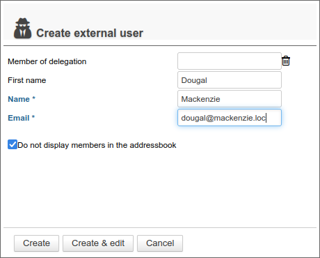 - Click on "Create" for simple, direct user creation, or click on "Create & edit" to create the external user and access configuration options.