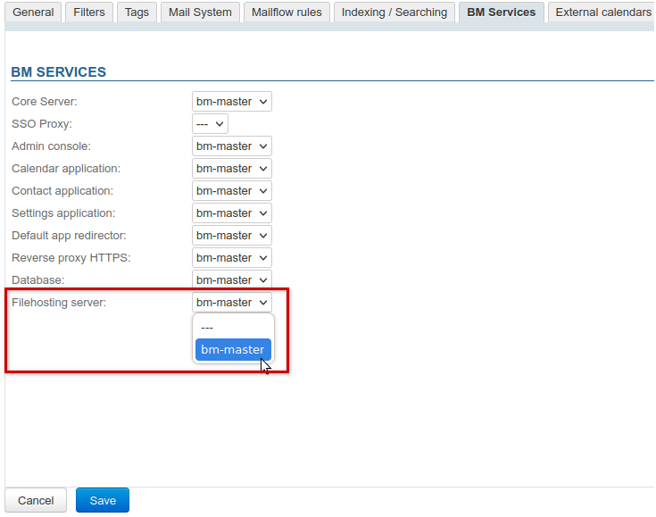 To activate the service, you must first tell BlueMind which server is to be used to store the detached files by assigning the "Filehosting File" role to the desired server, even in the case of a single-server architecture. To do this: