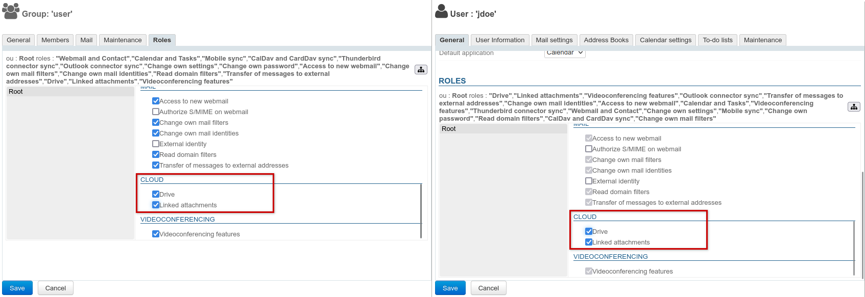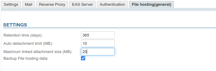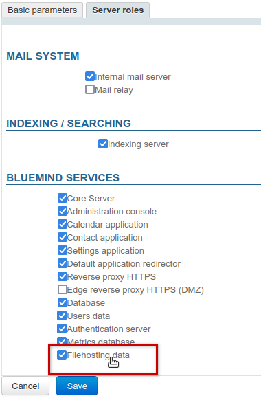 - in the "BlueMind Services" section, check the "Filehosting data" box: