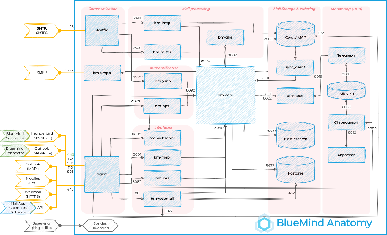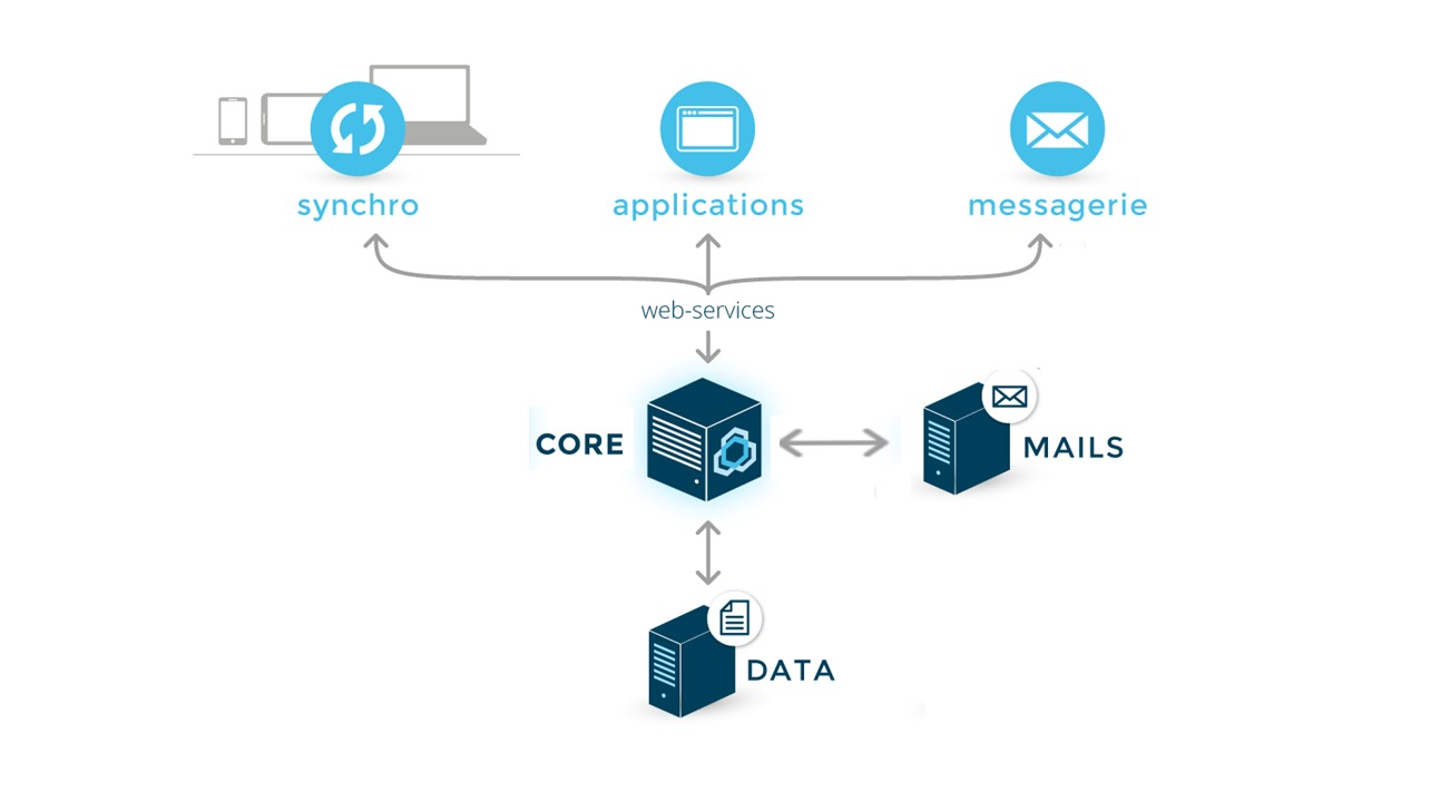 • All components, whether internal or external, use Web Services. This is useful for limiting incoming and outgoing BlueMind Mail flows (which are restricted to Web Services flows and mail flows) and ensuring the use of consistent management rules whatever the point of entry of a modification.
