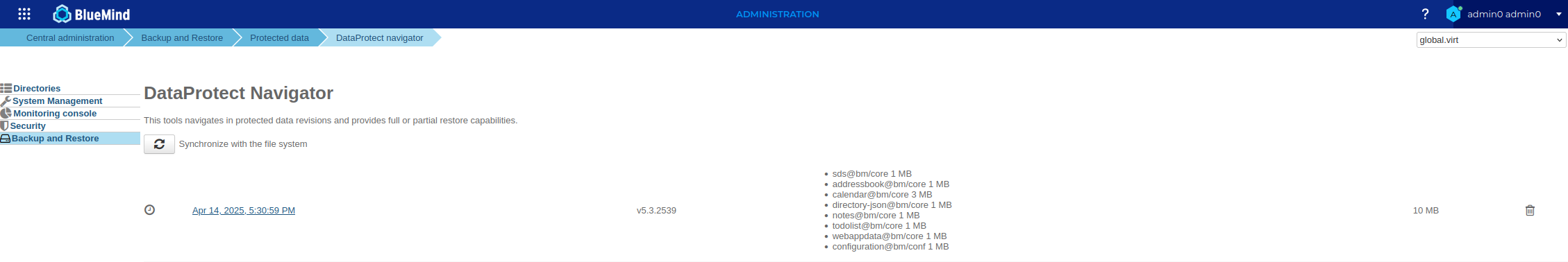 **→ This page shows the backups created by BlueMind and currently accessible.💡 Number of backups present