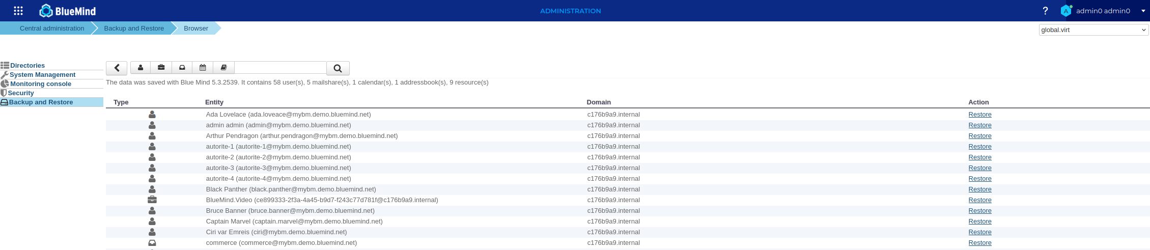 Single-user restoration is the feature that allows you to restore an entity's data quickly. BlueMind's DataProtect browser lets you navigate easily and graphically through backup data from the administration console.