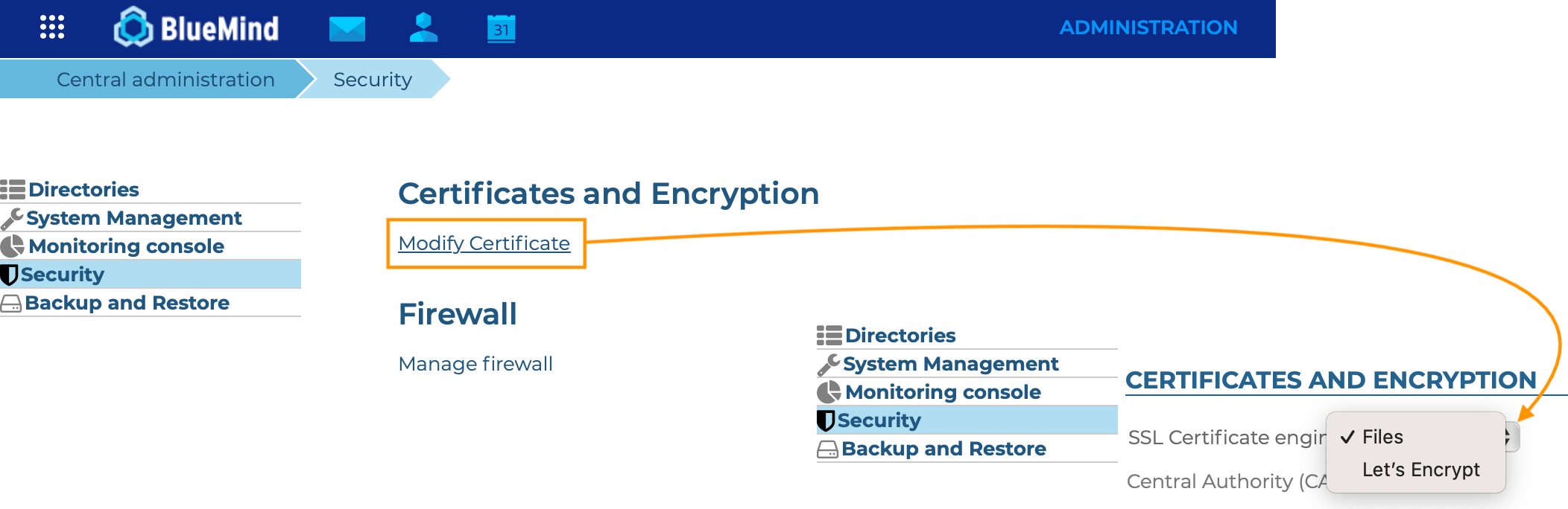 The BlueMind servers use certificate-based authentication. The certificates generated when BlueMind is installed can be replaced by customized certificates on a single-server installation.