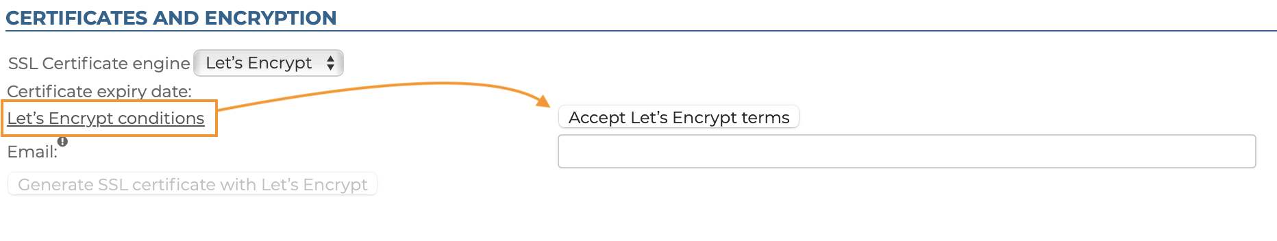 💡 The Let's Encrypt terms and conditions can be viewed by clicking on the "Let's Encrypt terms and conditions" link. Once done, the grayed-out button you must click to generate the certificate is enabled.
