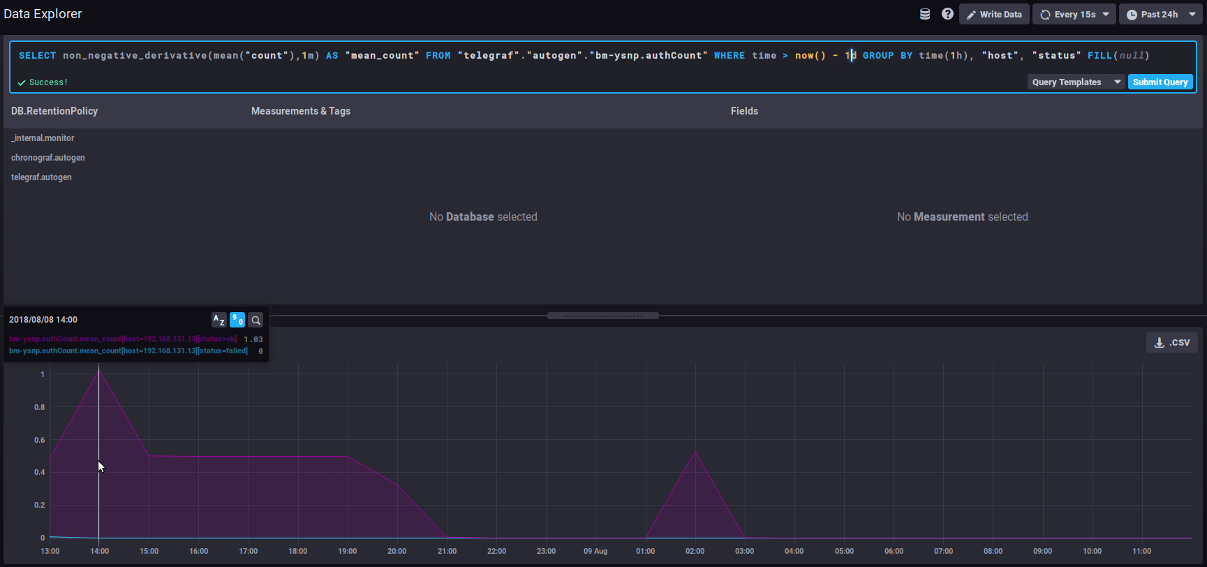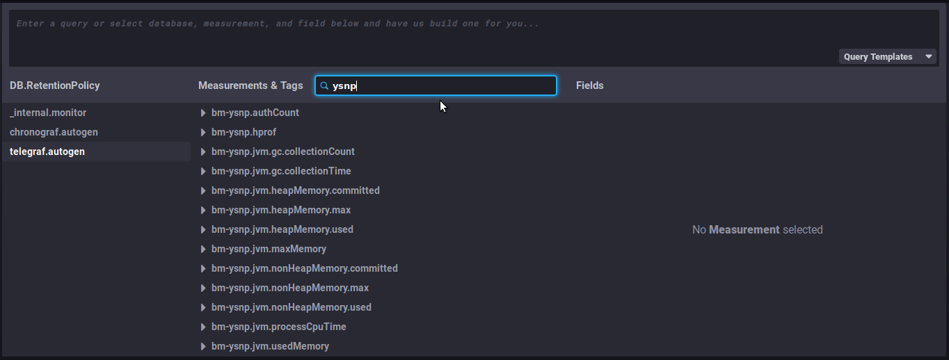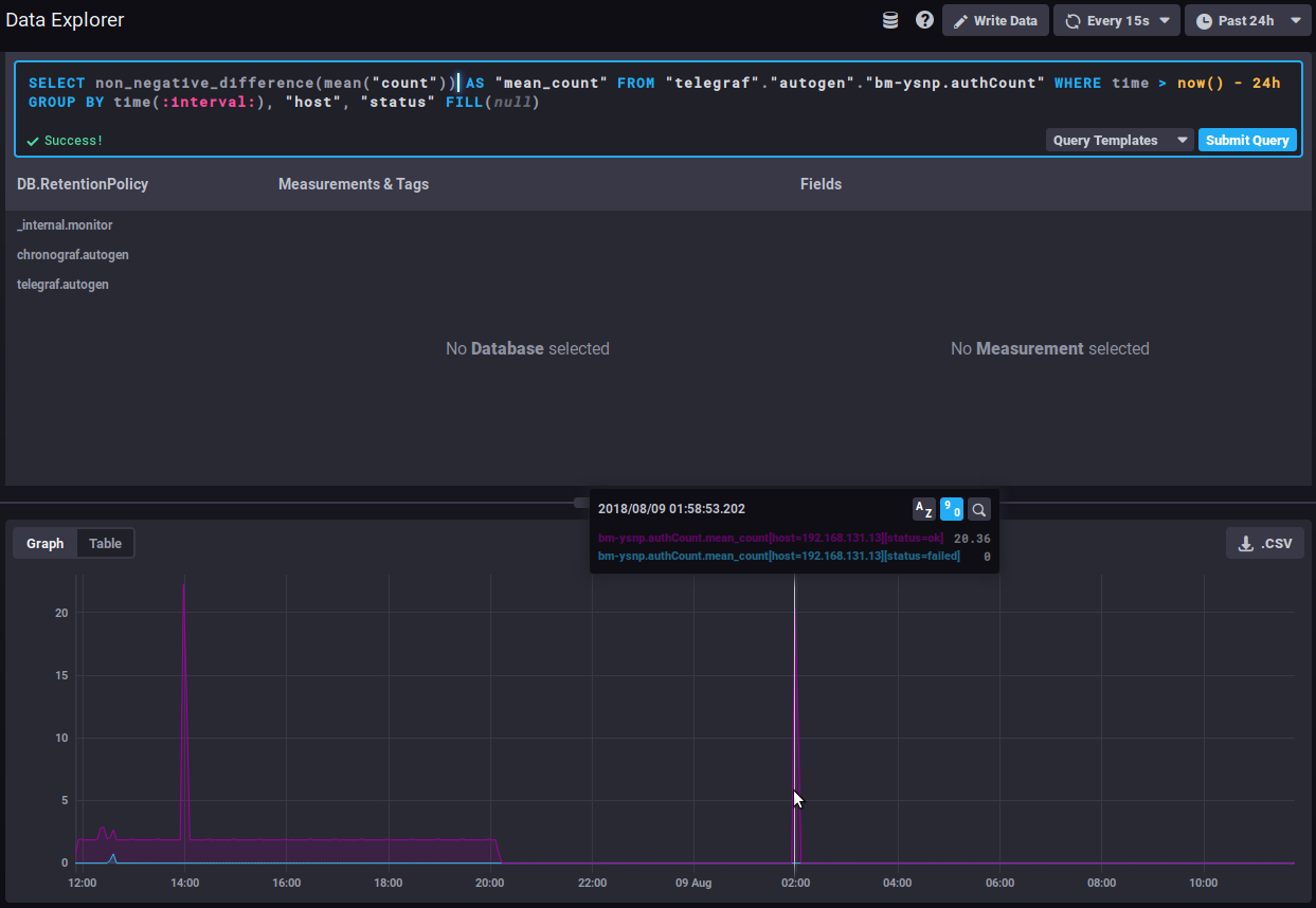 - DB.RetentionPolicy: the databases you want to analyze. The most relevant is telegraf.autogen which contains the actual data. The other databases (_internal.monitor and chronograf.autogen) contain internal system data.