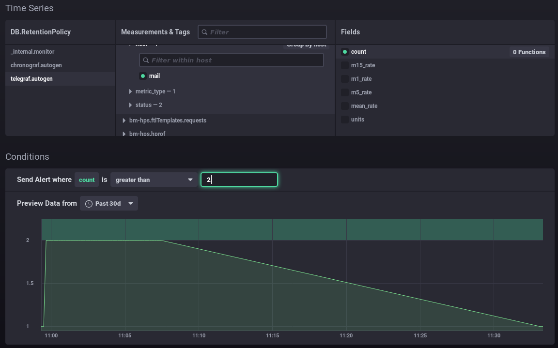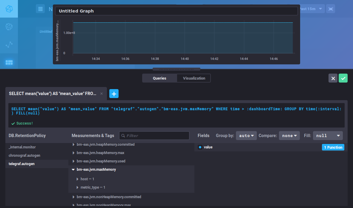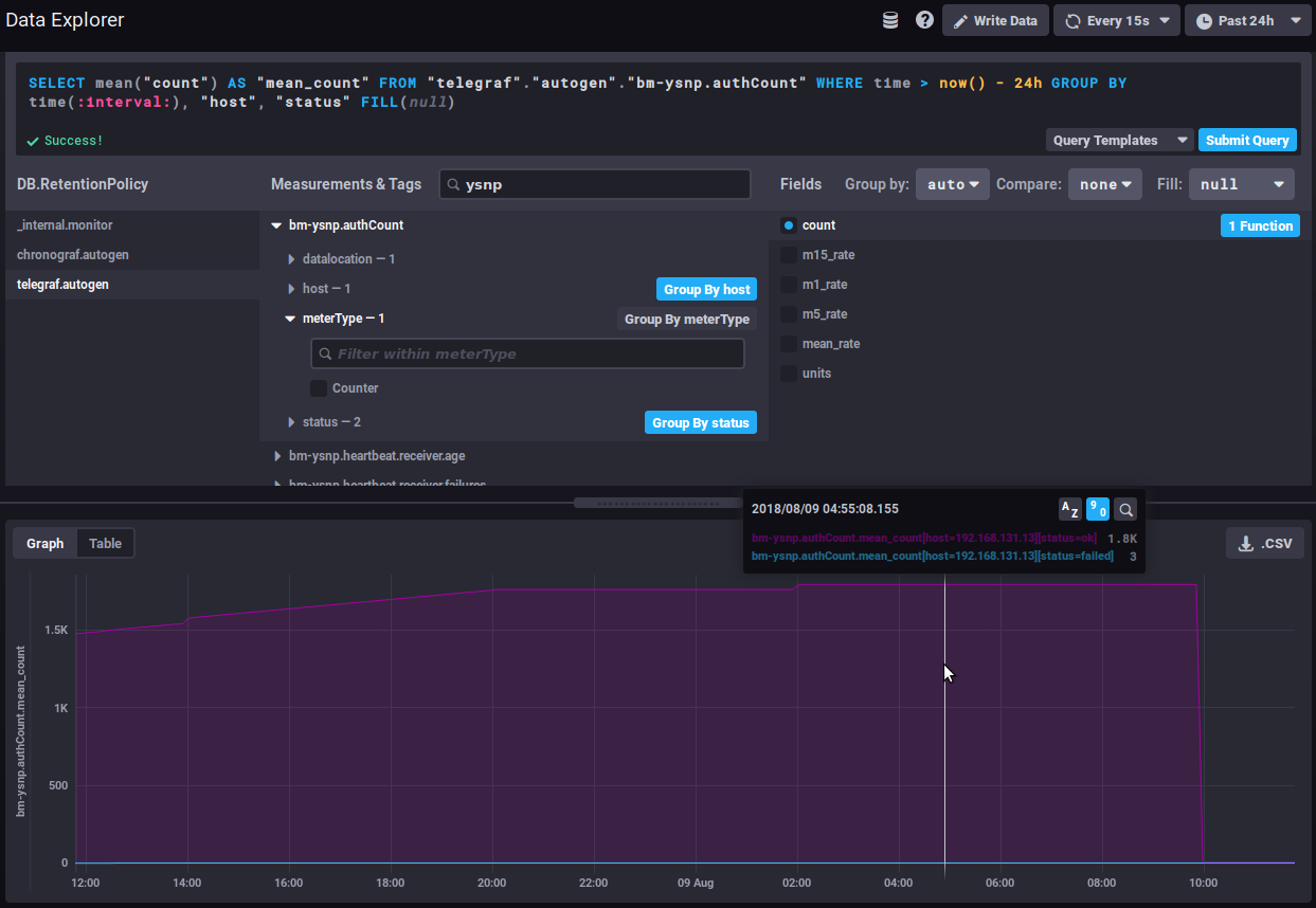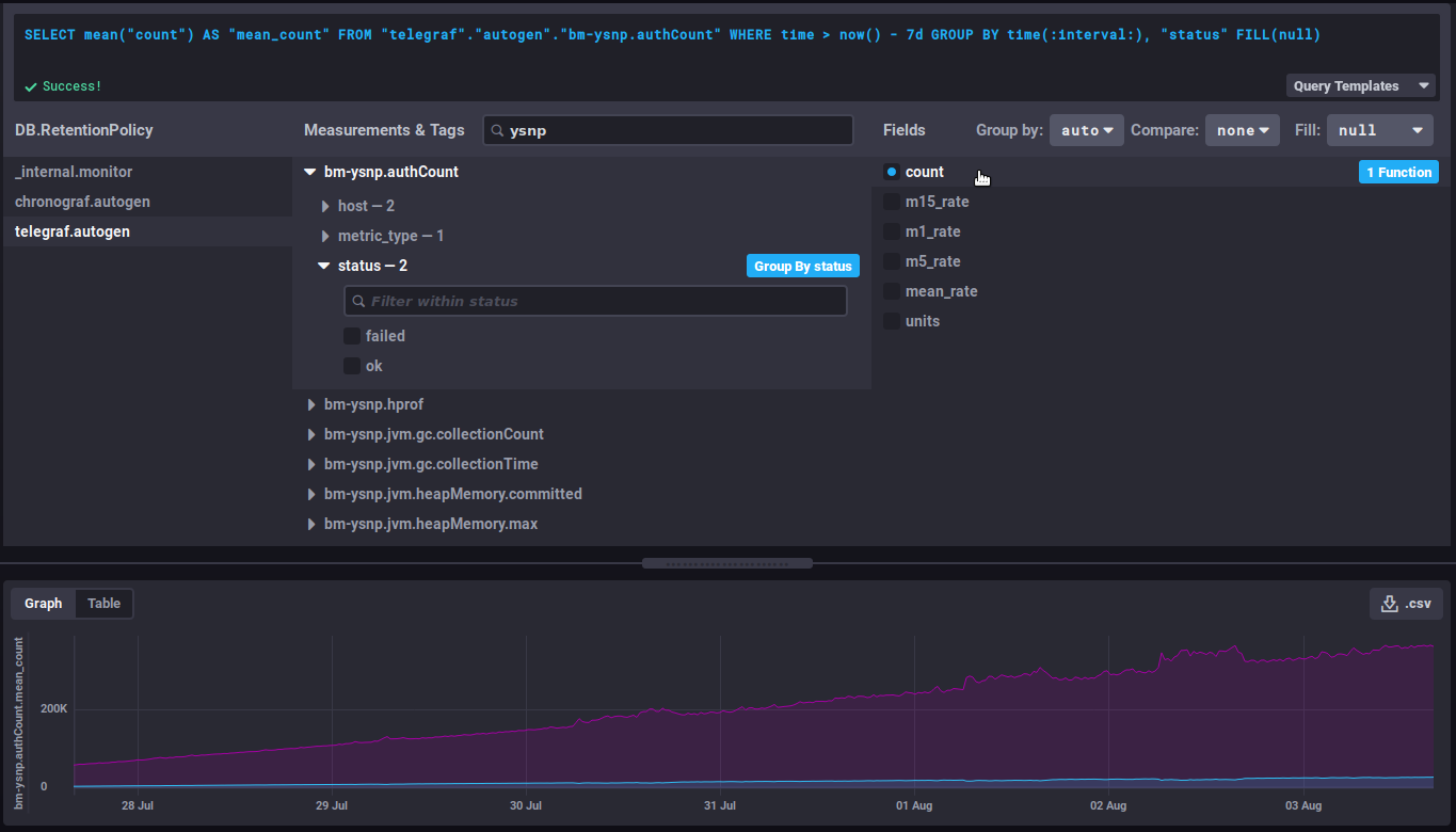 - DB.RetentionPolicy: the databases you want to analyze. The most relevant is telegraf.autogen which contains the actual data. The other databases (_internal.monitor and chronograf.autogen) contain internal system data.
