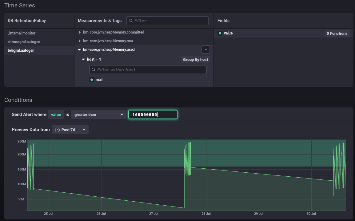 In this way, you can position your value as best as possible according to your data and its history: above the usual values, including peaks or not, etc. In this second example, an alert will be raised when memory consumption peaks every few days: