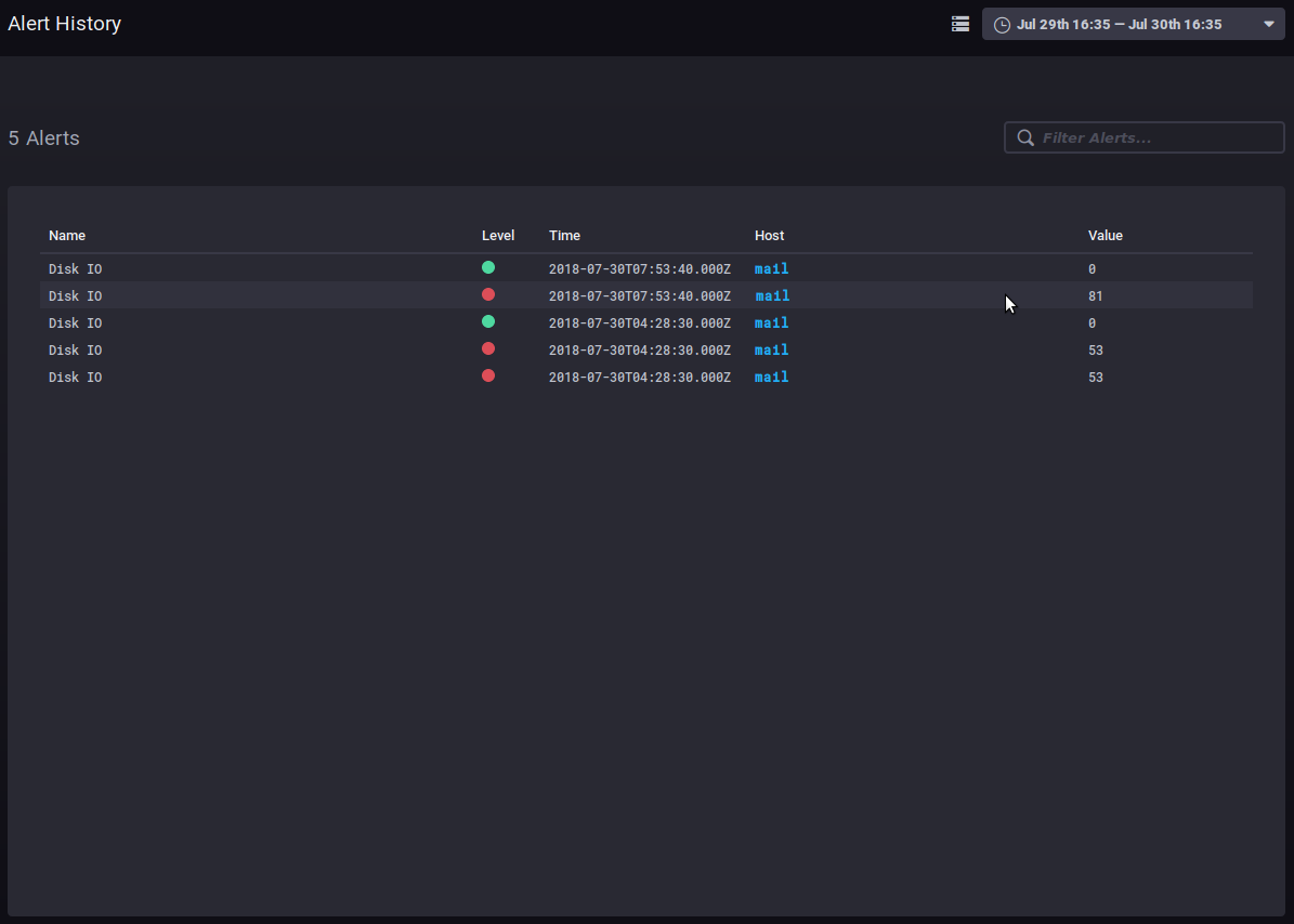 The history allows you to see the name, level, time, host involved and data value when the alert was raised.