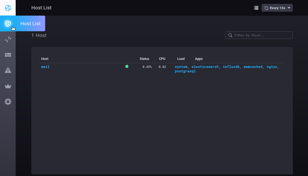 The Host List tab shows the list of monitored host servers, with the apps they include: