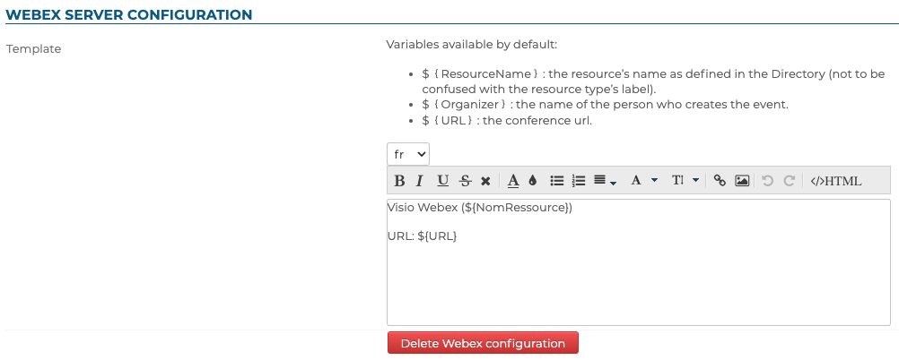 ⇒ Once the template has been saved, a resource named "Webex" is automatically created and displayed in the directory. This will enable users to create videoconferences automatically.