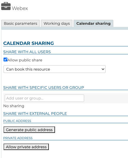 This resource is administered like any other resource, with share management opening up reservation rights and, de facto, the generation of videoconferencing links. So you have to give a reservation permission (share right "Can book this resource" or above) to the desired users or groups so they can create videoconferences for their events:
