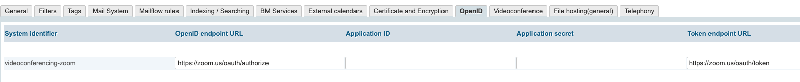 When a user uses Zoom videoconferencing for the first time, the OpenID protocol (see above) is used to authenticate the user to the Zoom server, and BlueMind will retrieve a secret key authorizing it to create videoconferences on the user's behalf.