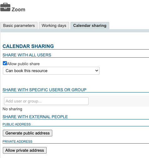 This resource is administered like any other resource, with share management opening up reservation rights and, de facto, the generation of videoconferencing links. So you have to give a reservation permission (share right "Can book this resource" or above) to the desired users or groups so they can create videoconferences for their events: