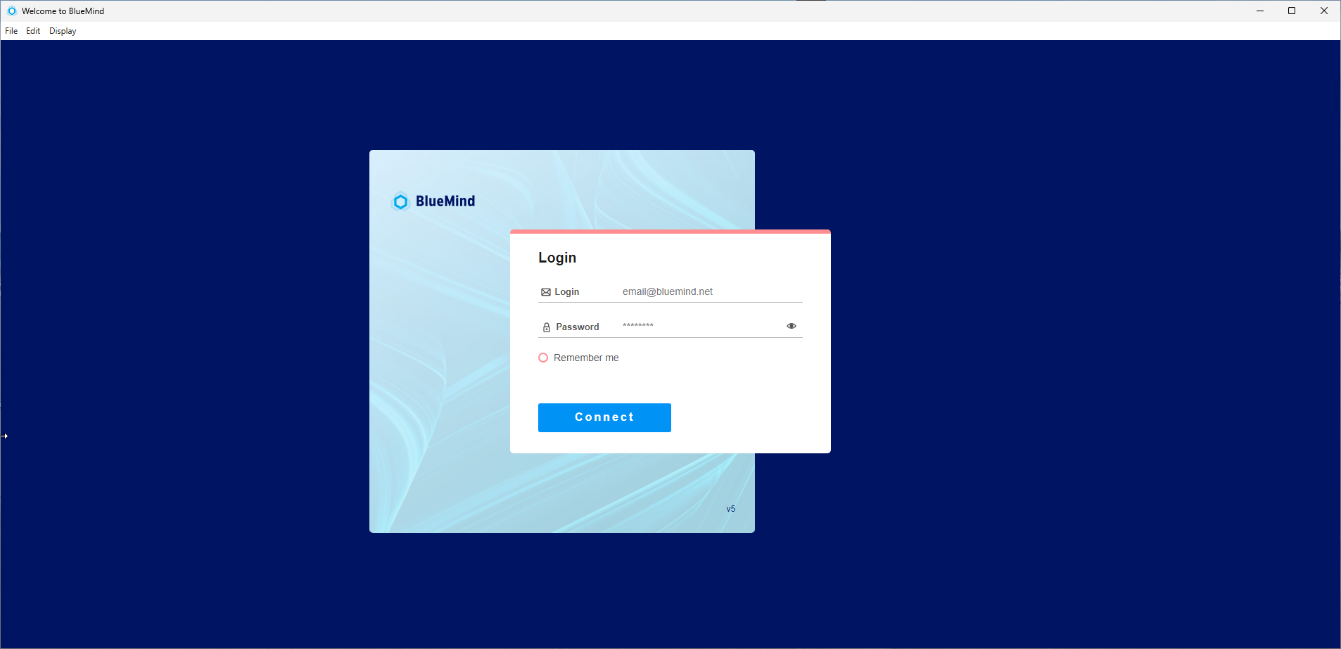 Once installation is complete, the software opens and displays the BlueMind connection screen: